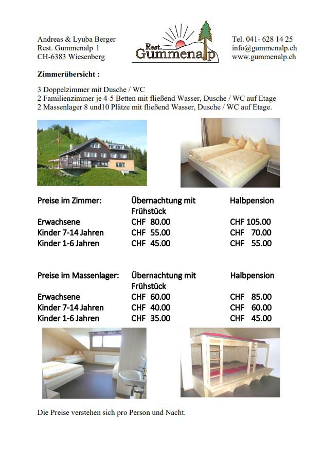Übernachtungen nur von Mittwoch bis Sonntag möglich. Das Halbpensionsangebot (HP) wird ausschliesslich an Freitagen und Samstagen angeboten. Für Gruppen ab 10 Personen sind Übernachtungen sowie Halbpension von Montag bis Sonntag möglich.